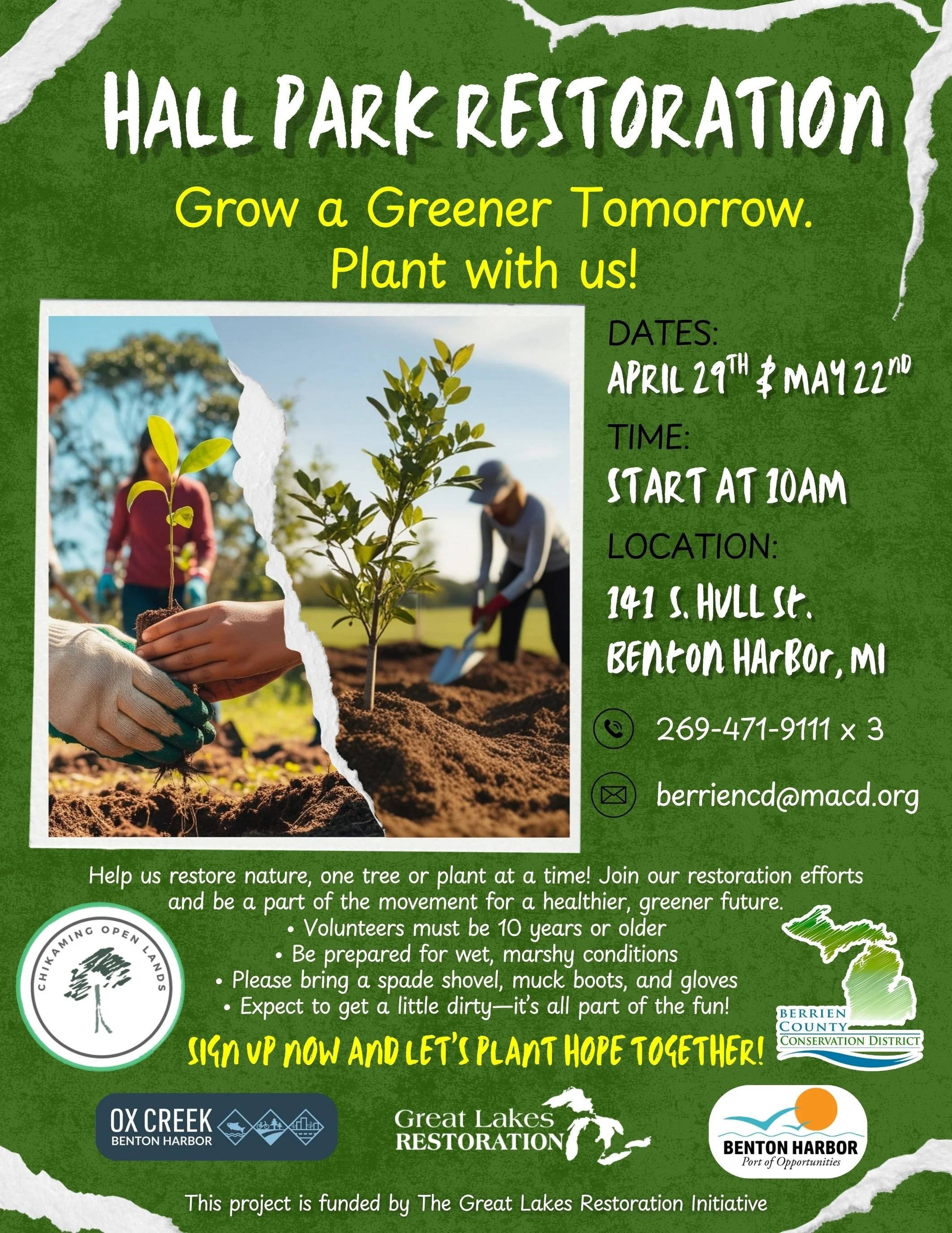 Join the Berrien County Conservation District for our Hall Park Restoration Plantings on April 29th and May 22nd!